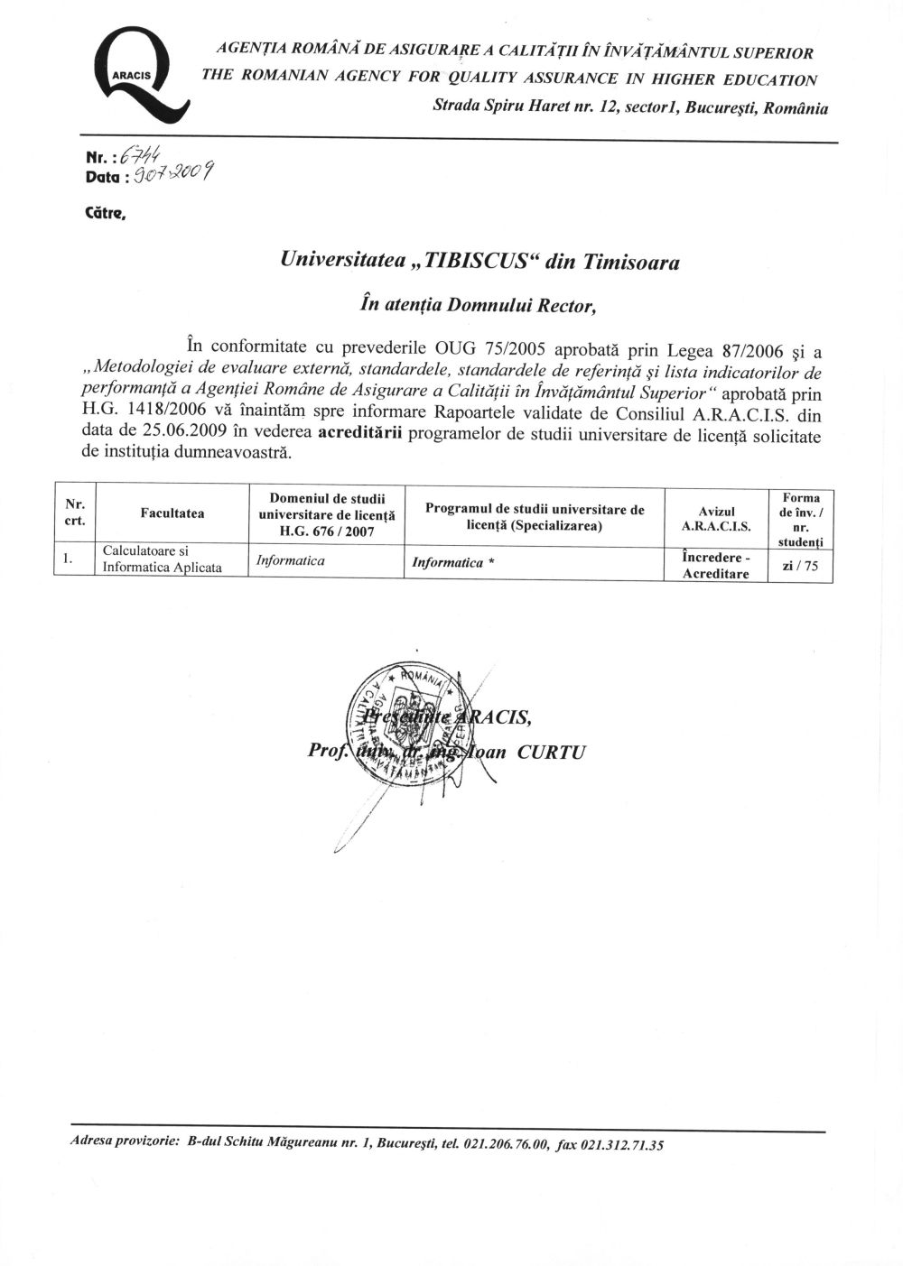 Specializarea de studii universitare de licenţă Informatică din cadrul Facultăţii de Calculatoare şi Informatică Aplicată a fost înfiinţată pe baza Raportului Consiliului Naţional de Evaluare şi Acreditare nr. RC P062/370A din 4 iulie 2000 şi a Hotărârii Guvernului Nr. 1215/29.11.2000, în cadrul Universităţii „Tibiscus” din Timişoara, acreditată prin Legea nr. 484/2002. Conform Raportului ARACIS nr. 6744/09.07.2009, a Raportului Departamentului de Evaluare din ARACIS nr. 6807/29.10.2015 pentru anul universitar 2023-2024, conform HG 367/2023, acreditarea este valabilă pentru: